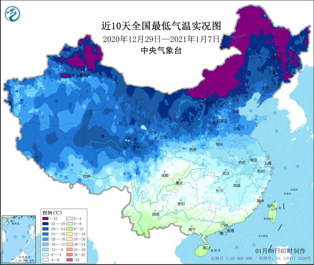 2020年12月29日到2021年1月1日,中国出现影响全国大部分地方的寒潮天气,中国从北方开始经历了一波强劲的降温,到1月6日时,北京出现-19.6℃的低温,这是1966年以后的最低数字。