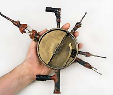 图 1931年劳伦斯和学生利文斯顿研制的一种微型回旋加速器(直径约10cm),这是世界上最小的加速器 图片来源 | LBNL
