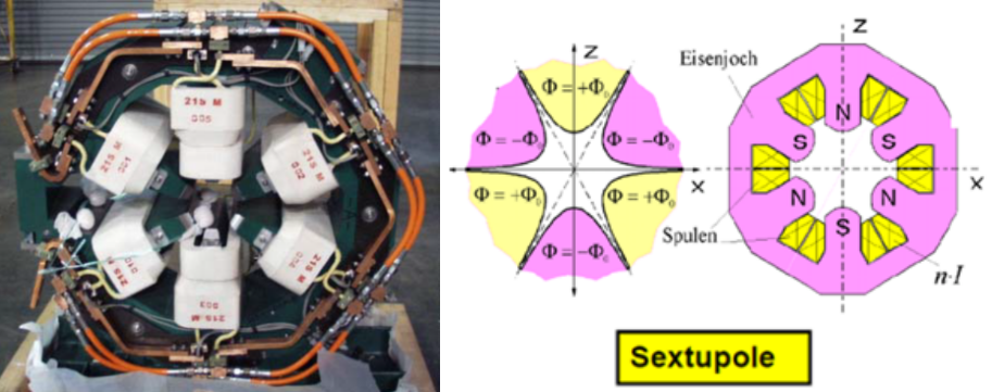上述磁铁是我们在加速器中最常见的。而在加速器运行中,为实现一些其它功能,我们还会使用六极铁消除粒子动量偏差带来的影响,八极铁消除朗道阻尼;同时,在加速器束流注入引出时还要使用bump铁和kicker铁,在一些试验终端例如重离子治癌装置中还要使用扫描铁等特殊磁铁。