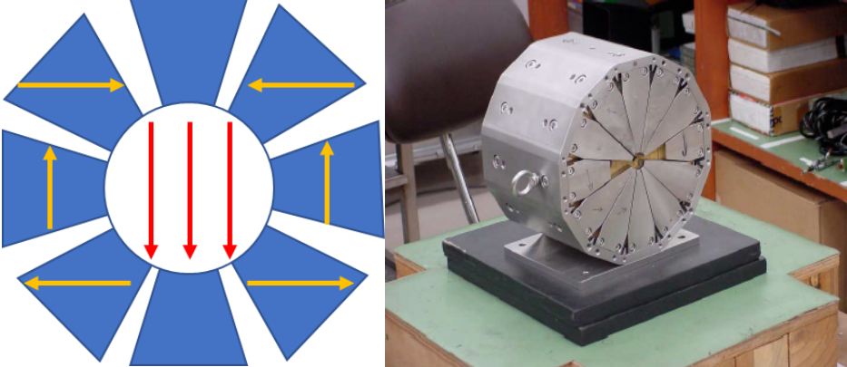 目前研制中的永磁磁体可分为两大类:一类是混合型或叫线圈代替型,在这类磁体里,利用永磁材料代替普通电磁铁的励磁绕组, 提供所需要的磁势。另一种是完全采用永磁材料制成,沿方位角按一定规律调变永磁材料的磁化方向或永磁材料的厚度比,以形成所需要的多极磁场。