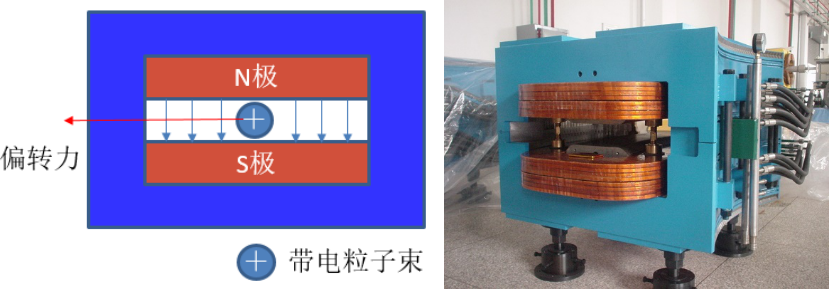 二极磁铁通过产生的磁场对带电粒子产生作用(见公式):