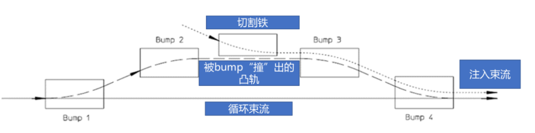 在注入过程中,循环束流(即在储存环中来回转圈的束流)会被bump磁铁“撞”出一个凸轨,这时预置接应的注入束流会在切割铁的帮助下与循环束流会师,夫妻双双把家还,最终一起被“撞”回轨道。