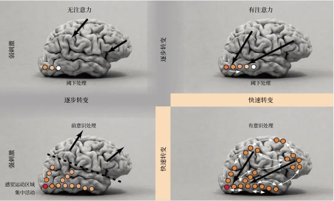 2006年,斯坦尼斯拉斯·迪昂和同事们绘制了这张图像,以区分大脑处理一个视觉刺激时所呈现的基本状态。颜色的深浅表明该部位大脑活动的强度,弯曲的白色箭头表明了这些部位之间的相互作用。较粗的黑色箭头指示注意力的整体方向(转向刺激或偏离刺激)。