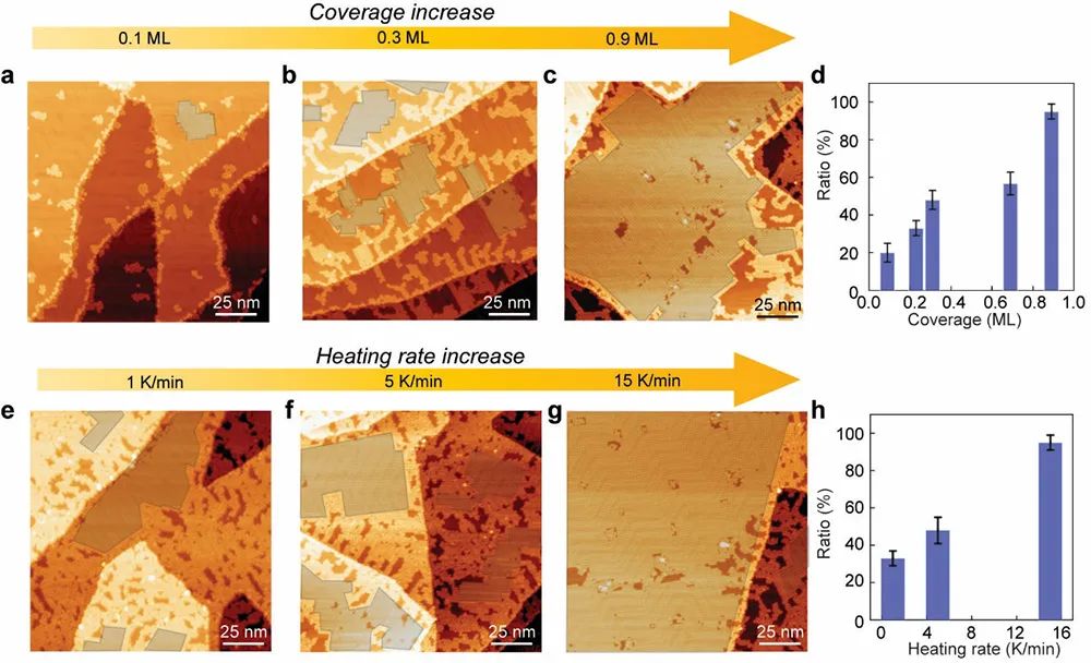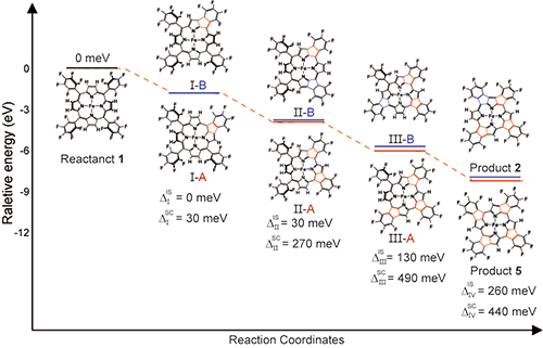 对FeF20TPP分子的内环化反应可以得到极高的前手性4号分子产物并形成自组装的机制问题,杜世萱课题组的陶蕾(博士后)与瑞士EMPA的Karl-Heinz Ernst 教授密切合作,开展了第一性原理计算。理论结果表明,前手性产物超高选择性是前驱分子在表面上吸附时形成的特殊自组装结构决定的。通过比较不同反应路径中每种潜在产物的相对能量发现,当考虑分子间相互作用所导致的空间位阻时,反应的选择性将会有明显提升 (图2)。实验上,通过控制覆盖度和升温速率,可以实现对4号分子产物产率从 20%到 90%的控制。反应中间产物的发现也间接证明了提出的选择性由反应前分子自组装决定的反应机制 (图3)。