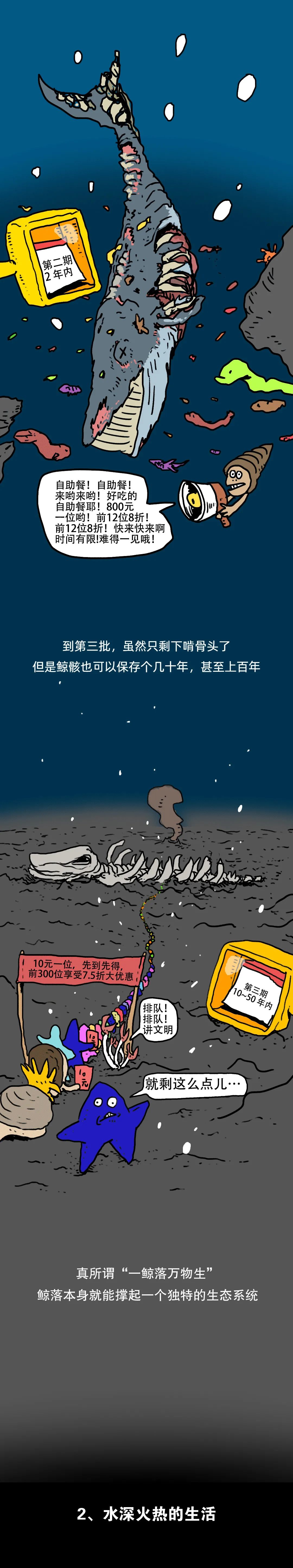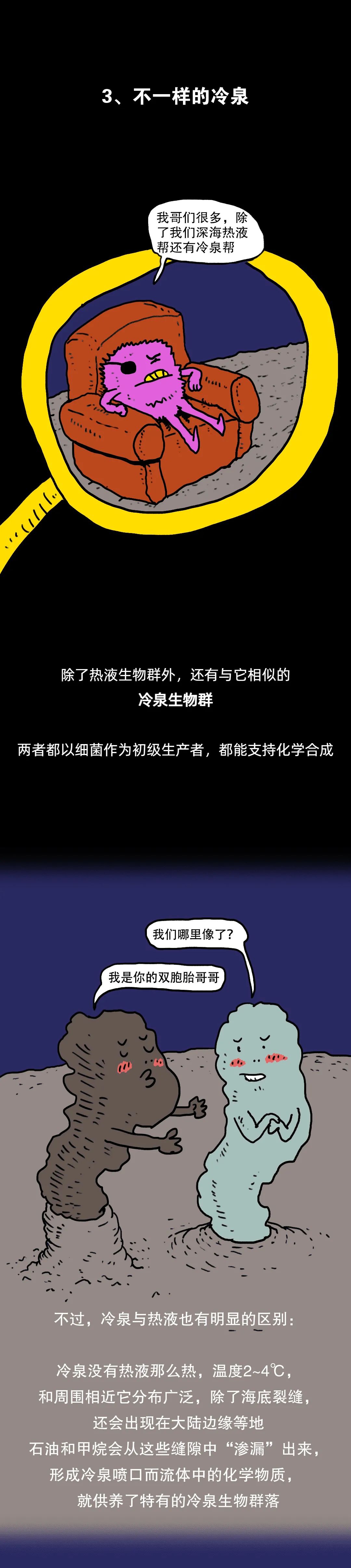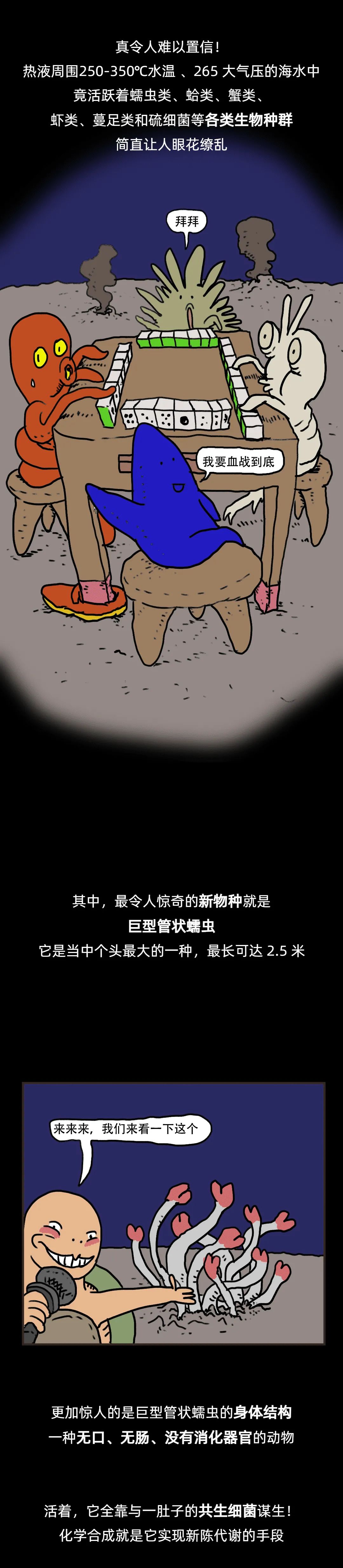 除了发现由浅海区掉落的鲸落“自助”,各种生物粪便、死亡分解的碎屑等颗粒外,科学家还在热液和冷泉附近发现了细菌。原来,地球真的存在一个新的生命系统!在这里,化合作用代替了光合作用,细菌代替了植物初级生产者的职能,而这些深海生物的栖息地——热液、冷泉、鲸落也被人们称为深海生命的绿洲!