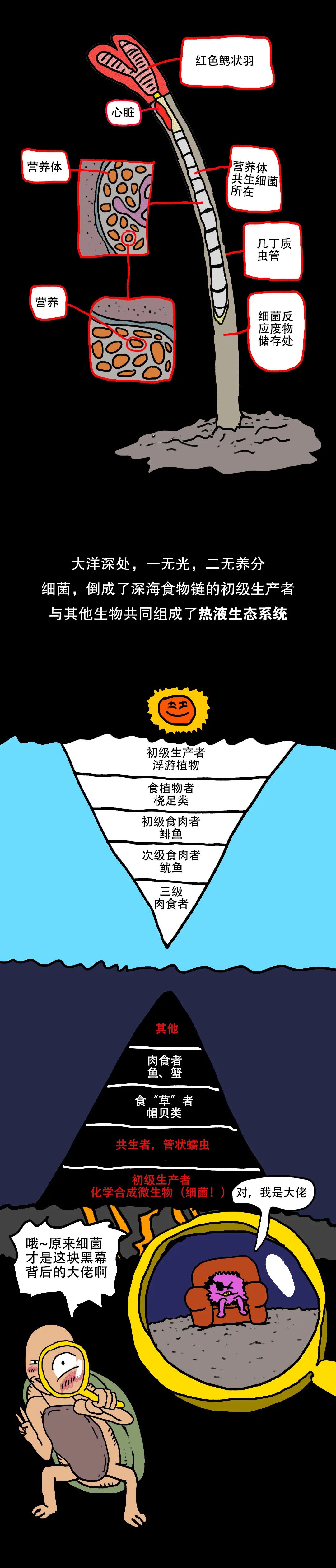 在有阳光的浅海区,有能进行光合作用的植物做初级生产者。那黑暗的深海区呢?无法进行光合作用,植物无法存活,那里的基层生物到底靠什么存活?