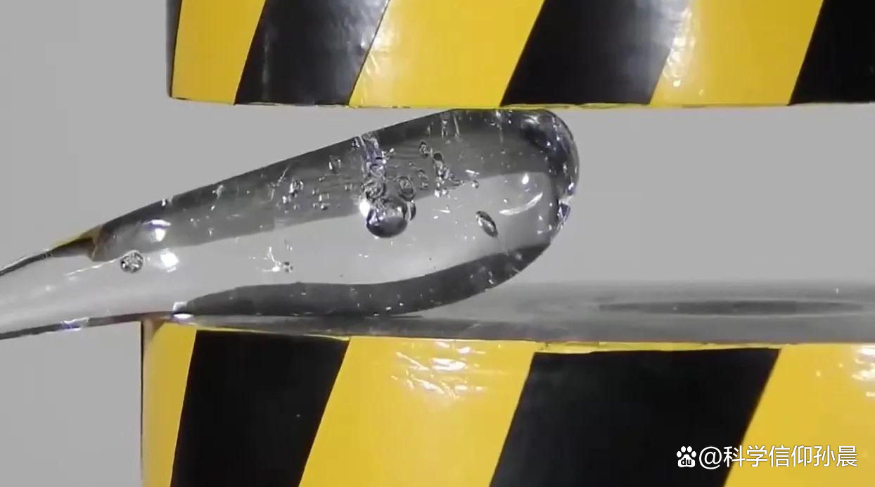 我们用一条硬纸板搭在两张桌子之间做成一个简易的小桥,然后把手机放上去,桥瞬间就塌了。当如果我们把这条硬纸板弯成拱形,再把手机放上去,它就可以支撑得住了,这就是形变使硬纸板具备了较强的压应力,所以可以顶得住上方增加的重量了。弄懂了压应力,我们再来看鲁伯特之泪。当烧热的玻璃融化后滴落于冰冷的水中,会瞬间遇冷凝固,但凝固是有先后顺序的。玻璃的最外一层会率先凝固,而此时内部还没有完全冷却,这就产生了一个差异,那就是外部瞬间冷却凝固,而内部是缓慢冷却凝固。
