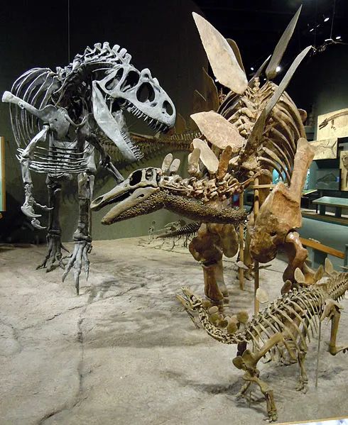 Denver自然科学博物馆的异龙和剑龙骨架摆在一起,展示出“冤家”相见的模样 | mrwynd / Wikimedia Commons