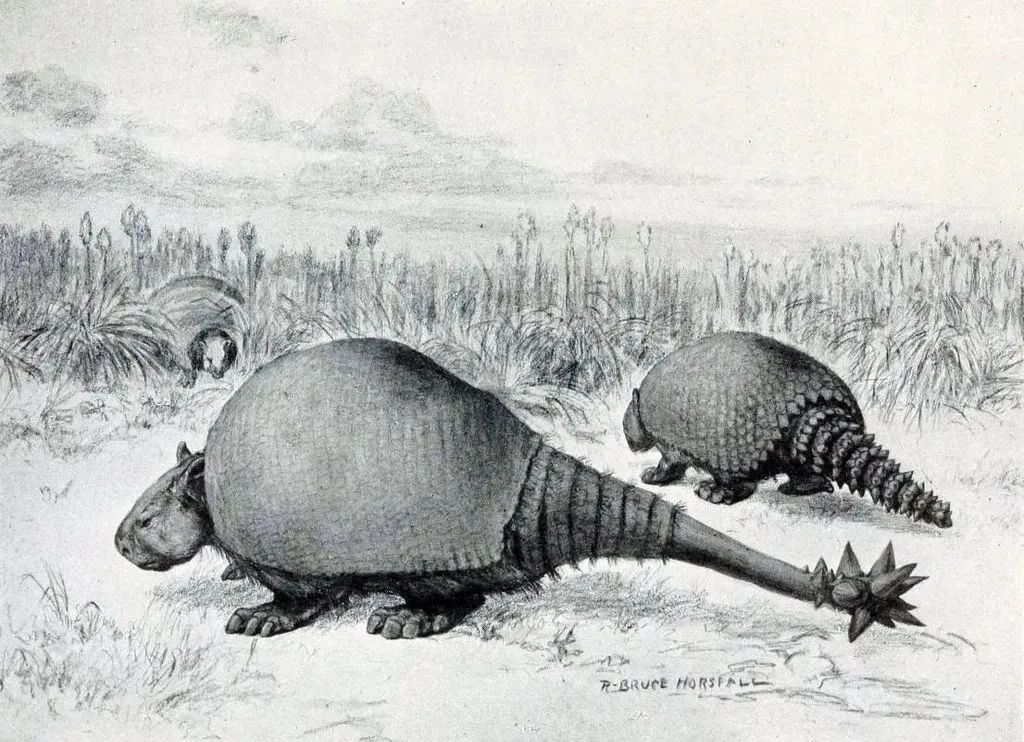雕齿兽科的星尾兽Doedicurus,尾巴如同一个长满尖刺的钉头锤,出自A history of land mammals in the western hemisphere | Wikimedia Commons