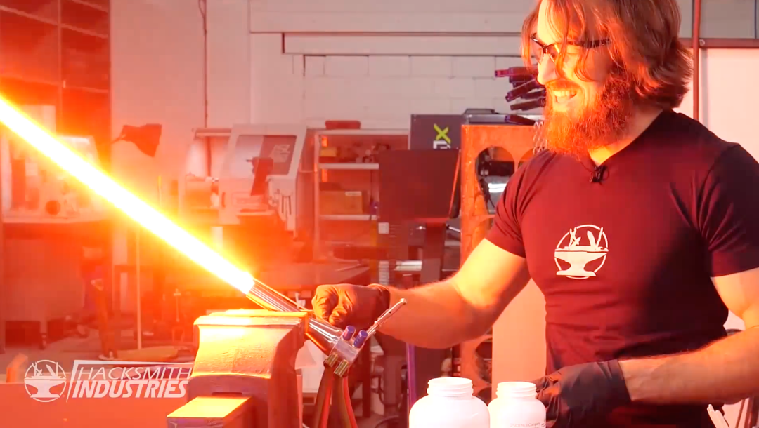 不过,这种“低能”的光剑自然不能满足看热闹不嫌事大的粉丝。视频博主Hacksmith Industries也尝试过制造真正的光剑。他们找来了一罐液化石油气,将它气化喷出,并让石油气和空气燃烧产生等离子体。在这个过程中,他们还用特定的喷嘴,尽量将离子体维持在一个稳定的形状……