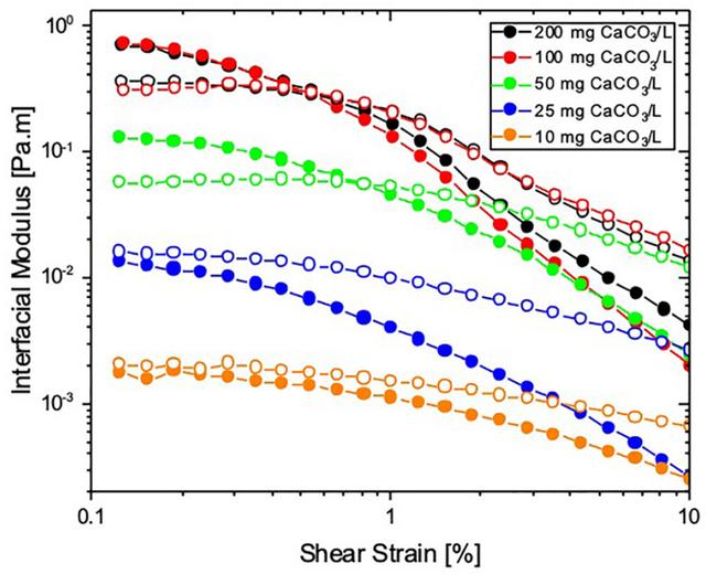 前文中提到,我们往往会看到碎裂的茶膜,因此贾科明就想看看究竟在多大的应力振幅下能让这层膜裂开。如果用“模量”指示膜何时会碎裂(膜的强度),那就是当损耗模量大于储能模量时。在这里,相比于弹性和黏性,用储能和损耗这组词可以让我们更直观地感受到“为什么膜会破裂”。 当碳酸钙浓度较高(100和200 mg/L)时,较低的剪切应力振幅(0.5%)就能让茶膜碎裂,即G″ > G′。然而,当碳酸钙浓度降低到50 mg/L时,则需要更高的应力振幅(0.8%)才能让茶膜裂开,因此以储能为主(G′ > G″)的茶膜更有韧性而不易碎。但对于10和25 mg/L而言,无论应力怎么变化,损耗模量一直大于弹性模量,此时的茶膜就像流体一样,难以成型。