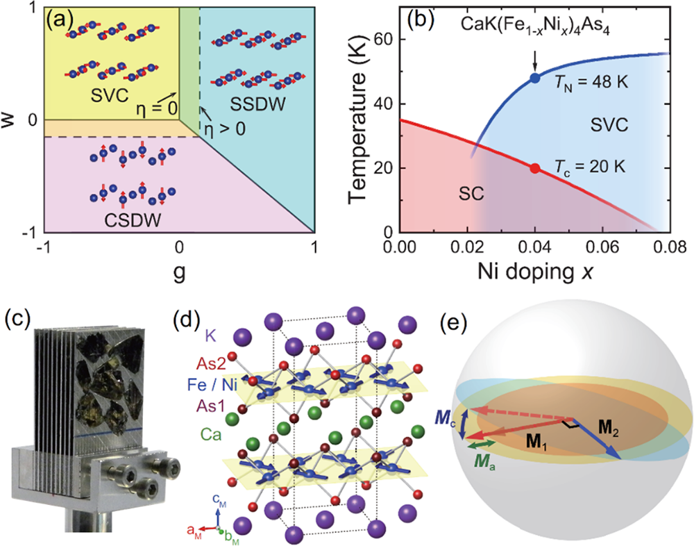 图1. (a) 铁基超导体磁结构的平均场相图(b)CaK(Fe1-xNix)4As4体系的电子态相图 (c)实验所用单晶样品(d)自旋涡旋序(SVC)结构(e)SVC态下自旋涨落方向