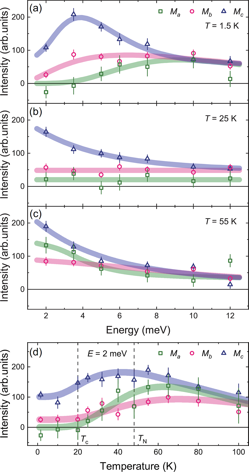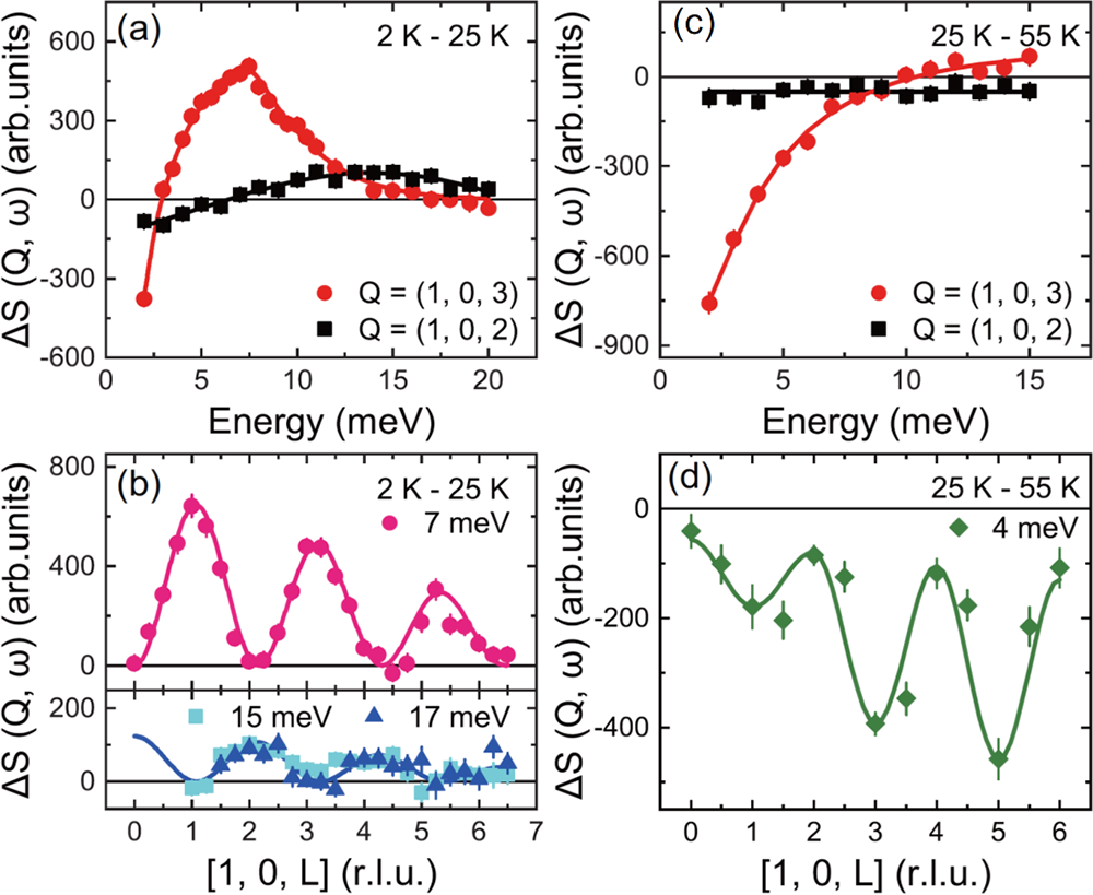 最近该团队在铁基超导自旋涨落研究方面又取得重要进展,确立了超导态下自旋涨落的普遍择优取向。如图1(a)所示,铁砷化物超导体具有三类不同的磁性基态:面内共线的条纹状自旋密度波(SSDW),面外共线双轴c取向的电荷-自旋密度波(CSDW)和面内非共线但共面的自旋涡旋序(SVC)。它们可以统一用双分量的传播矢量来描述,并在平均场相图的不同区域互为邻居,决定其磁性基态的关键因素在于朗道参数(g, w, η)的符号和自旋-轨道耦合的具体形式。已有实验结果表明前两者磁有序态下自旋共振模具有c方向极化的特征,然而在晶格对称性为四方相下的SVC态的自旋涨落取向尚不清楚。通过在CaKFe4As4中掺入Ni,他们获得了TN=48 K SVC态与 Tc=20 K超导态共存的样品,单晶尺寸达到厘米量级,用于非弹中子散射实验总样品量为4.426克(图1(b)和(c))。该样品在自旋涡旋磁结构下,自旋双分量呈90°锁定,原则上自旋涨落可以是面外的c方向或面内a方向,而整个SVC结构面内磁矩转动会带来一个具有手性的残余序参量,称之为自旋涡旋密度波(SVDW)。在如此特殊的自旋-轨道耦合下会出现怎样的自旋各向异性?首先,非极化中子散射实验表明,该体系仍然存在类似于CaKFe4As4的奇偶调制双自旋共振模,共振能量分别为7 meV和15 meV(图2(a)和(b))。在SVC态下,低能激发会凝聚到静态磁序中,形成奇数调制的自旋能隙(图2(c)和(d))。接下来,他们利用极化中子散射详细分析了自旋涨落的空间各向异性,如图3所示,在超导态和SCV态共存区(T=1.5 K)、SVC态(T=25 K)和顺磁态(T=55 K)下,c方向的自旋涨落Mc均在低能占据主导。特别是超导态下,自旋共振峰有明显的c方向极化行为,而面内轻度的各向异性可能与SVDW序有关(图3(a)-(c))。详细温度依赖测量表明,该c方向为主的自旋涨落持续到了100 K左右,远高于磁相变温度(图3(d))。该研究确立了SVC态下铁基超导体仍然具有明显的c方向择优自旋涨落,填补了铁基超导体中自旋-轨道耦合效应的最后一块拼图,指出了不同磁性基态之间的具体联系(图4)。无论铁基超导体磁性基态是何种构型,在进入超导态之后的自旋共振模中,均具备c方向优先的普遍特征。该研究还意味着,铁基超导中电子配对可能有轨道选择倾向,如c方向择优的自旋涨落来自某些特定电子轨道与局域自旋的强烈耦合,在远高于超导和磁相变温度之上就已存在,进入超导态之后会被迅速增强。