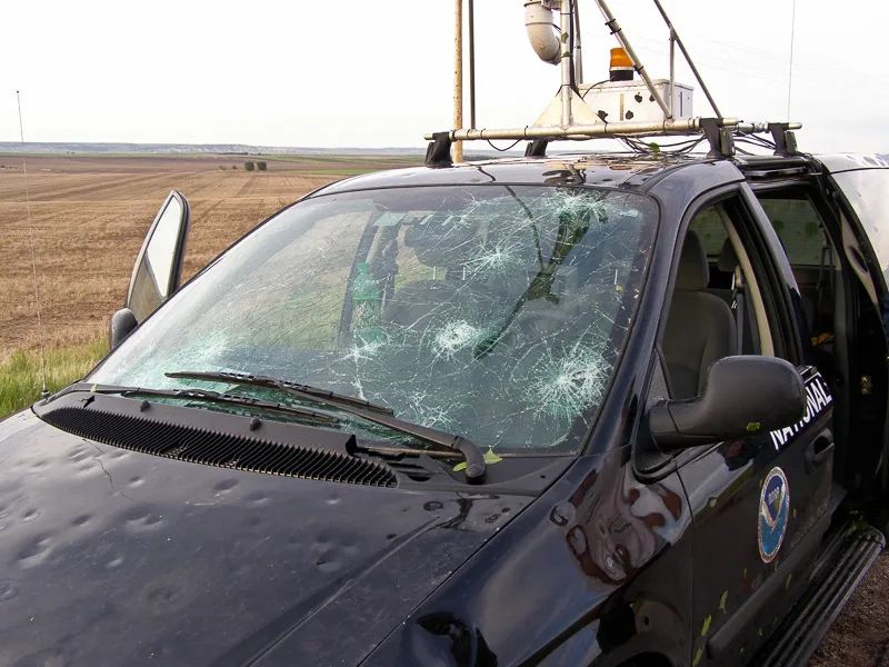 冰雹可以砸破车辆挡风玻璃(图片来源:NOAA National Severe Storms Laboratory)