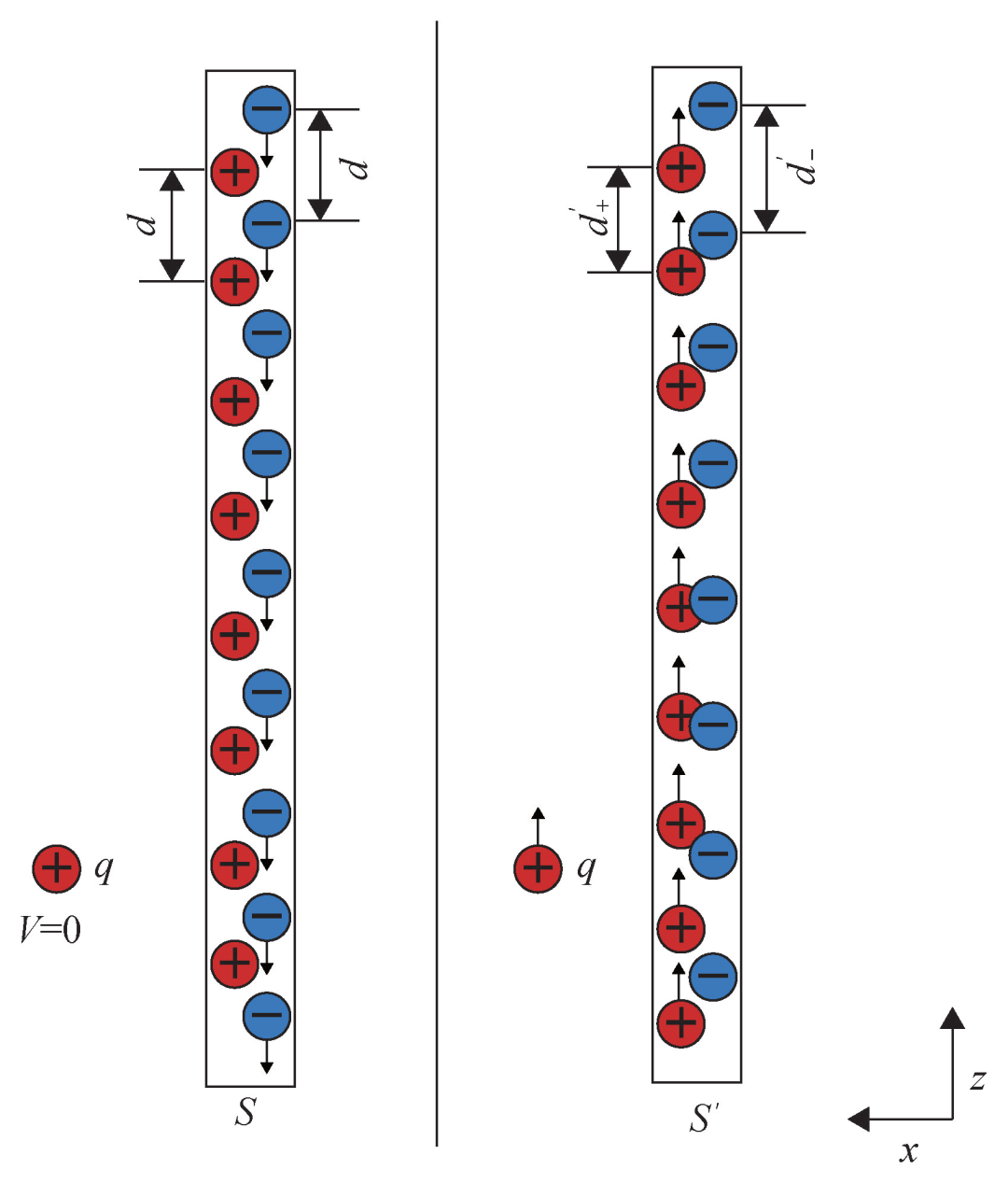 用一个简单的物理假设来理解导线中的电流I,就是在实验室系S中,导线中的电子一个个间隔均匀排列并以匀速-v沿着z方向运动,而正电荷也以同样的均匀的间隔排列并保持静止。在这一假想实验中,我们设定S系中的观测者测得导线是电中性的,即在S系中负电荷之间的间隔d-严格等于正电荷之间的间隔d+,设d-=d+=d,对应的正负电荷线密度的绝对值为