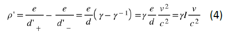 现在换到跟负电荷一起以-v速度沿着z方向运动的S′系。在S′系的观测者看来负电荷是静止的,而正电荷以速度v沿着z方向运动。跟伽利略变换不一样的是,在洛伦兹变换下,电荷之间的间距要发生变化,如图1所示,导致在S′系里正负电荷的密度是不一样的,从而在导线中产生净电荷密度。那么如何得到S和S′系中不同的电荷间距关系呢?这就要用到上面给出的洛伦兹变换。先来看S系的观测者是如何理解以-v速度匀速运动的负电荷间距的,在他看来,相邻两个负电荷之间的空间距离是由下面两个时空事件之间“时空距离”的空间分量来确定的。时空事件一:第N号负电荷在时刻t位于时空坐标(x,y,z1,t)处;时空事件二:相邻的第N-1号负电荷在同时刻t位于空间坐标(x,y,z2,t)处,于是在S系中测到负电荷之间的间距d-=z2-z1。这两次测量事件在运动的S′系中对应的时空坐标分别为(x′,y′,z′1,t′1)和(x′,y′,z′2,t′2)。这里要注意,狭义相对论的一个重要结论是所谓“同时性”是相对的,在S系中看起来是同时的两个测量事件在S′系中并不同时,因此t′1并不等于t′2,但在S′系中负电荷是静止的。因此,跟S系的观测者不同,为了确定相邻负电荷之间的间距,S′系的观测者并不需要两次测量是同时的;换句话说,他同样可以利用这两次时空事件的坐标得到S′参照系中的负电荷间距d'-=z'2-z'1。现在我们就可以通过上面列出的洛伦兹变换公式得到d′-=γd-,由于γ是一个总是大于1的因子,因此一个匀速运动的物体在其运动方向上的长度要缩短一个因子γ-1,这就是狭义相对论里非常著名的“尺缩”效应 (与距离的尺缩效应相对应,时间差在变换参考系后延长一个因子γ称为“钟慢”效应[3]) 。同样的分析也适用于正电荷的情况,唯一不同的是,对正电荷来说情况正好相反,在S系中静止,而在S′系中匀速运动,因此可以得到d′+=γ-1d+。比较一下上面得到的S′系中正负电荷间距d′+和d′-,可以明显看出它们并不相等,因此S′系中的导线是带电的,净电荷线密度为