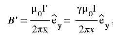 那么在S′参照系的观察者看来,试探电荷以v的速度运动,导线中的电子是静止的,而正电荷以v 的速度沿着导线运动。根据电流的定义,我们得到在S′系的电流I′不变,还是等于S系中观测到的电流I,同时导线依然是电中性的,从而产生与S系中一样的电磁场。现在我们可以总结一下对这一问题进行伽利略变换得到的结果:在S′系中观测到的电磁场严格等于在S系中的电磁场,也就是在伽利略变换下电磁场不变 E′ = E, B′ = B ,因为产生它们的“源”:电流和电荷密度都不变。但是,原先在S系中静止的试探电荷,在S′系的观测者看来以v的速度沿着导线方向运动,从而受到一个指向导线的大小
