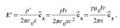 现在我们已经得到S′系中的电荷密度ρ′和电流强度I′,下一步可以计算由上述电荷密度和电流强度引起的电磁场和试探电荷q的受力情况了。再提醒一下,在S′系里的试探电荷q以v沿着z方向运动。简单的计算过程如下: