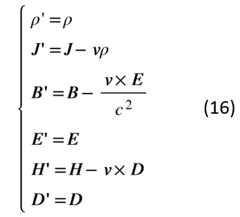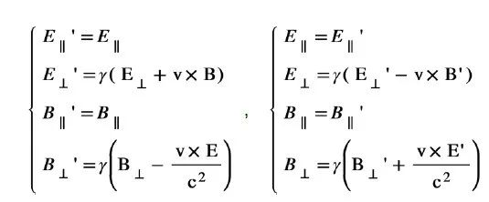 接下来跟前面一样,我们把实验室参照系记为S,把随着介质一起运动的参照系记为S′。由于在S′中介质保持静止,其电磁学特性由ε和μ来刻画,为了解决上述动体介质电动力学问题,只要简单地做一个从S′系到S系的参照系变换就行。在近期的讨论中,也有同学提出如果有多块运动介质怎么办?其实这正是使用实验室参照系的优势,不管有多少块介质以不同的速度运动,都可以变换到唯一的实验室参考系来统一描述。下面,我们就用洛伦兹变换来解决这个问题。从前面这个特殊例子,可以知道在洛伦兹变换下,电磁场E,B和源场电荷/电流密度ρ和J都必须跟着变,这里我们先给出严格的洛伦兹变换下场和源的正变换和逆变换形式: