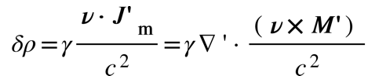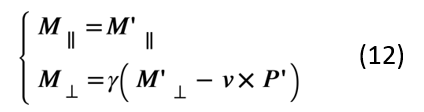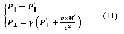 利用磁化强度与微观分子电流之间的关系,我们可以类似地得到磁化强度在不同参照系之间的变换关系,这里不做详细的推导,有兴趣的读者可以参考相关文献[4],最简洁漂亮的推导可以在泡利的Theory of Relativity中找到。与电极化强度类似,在S系中的磁化强度也有两项贡献,除了常规的分子电流带来的磁化以外,运动介质中电极化场的运动效应也将带来额外的贡献,两项相加可以得到: