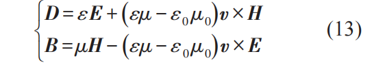下一步,我们利用S′系中已知的静态介质本构关系将P′和M′表示成E′和B′,然后再利用上述洛伦兹变换将E′和B′变换成E,B,最后将表达式里所有的γ都近似成1,就得到了精确到v/c一阶的S系中的本构关系如下[5],