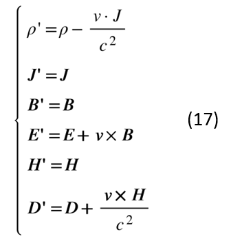 从中我们可以看出电荷密度和电流密度的变换关系与通过伽利略变换直接得到的完全一致,因此电极限下的准静态方程组的确满足伽利略变换。这在物理上也很好理解,在这组方程下t 时刻的电磁场完全由同时刻下的电荷密度分布ρ(r, t)和电流密度分布J(r, t)决定,电磁场自身独立的动力学特征被完全忽略以至于成为物质场ρ(r, t)和J(r, t)的“附属场”,从而满足伽利略变换。