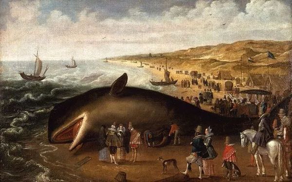 △出自1617年Esaias van de Velde的油画《搁浅在申维宁根和卡特维克之间的鲸鱼,旁边是优雅的看客》 图: Esaias van de Velde/Wikimedia Commons