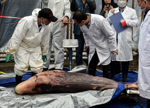 3月16日,专家从死亡的抹香鲸体内取出一头成形的抹香鲸胎儿,长2米、重110.5公斤。