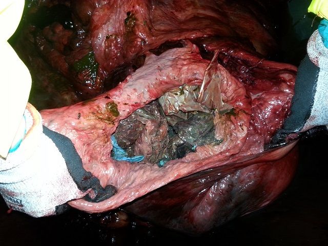 参与解剖工作的卑尔根大学动物学家利斯莱万德表示,这头鲸的腹部塞满至少30个塑料袋,其消化系统内没有食物,几乎全被塑料颗粒堵住。