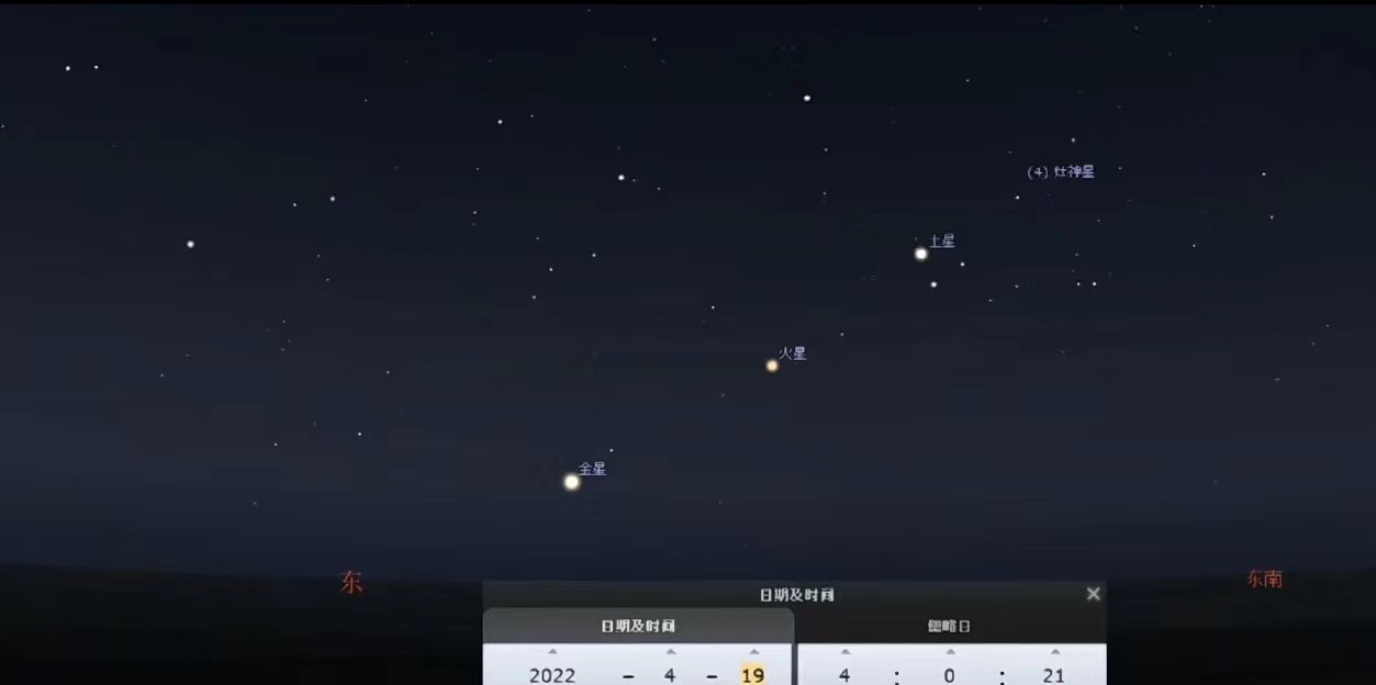 4月20日,大象新闻记者从郑州摄日者天文台台长李稳处了解到,从4月底至5月底,天气晴朗的日出之前,天文爱好者们就可以观测到30年一遇的“四星连珠”了。