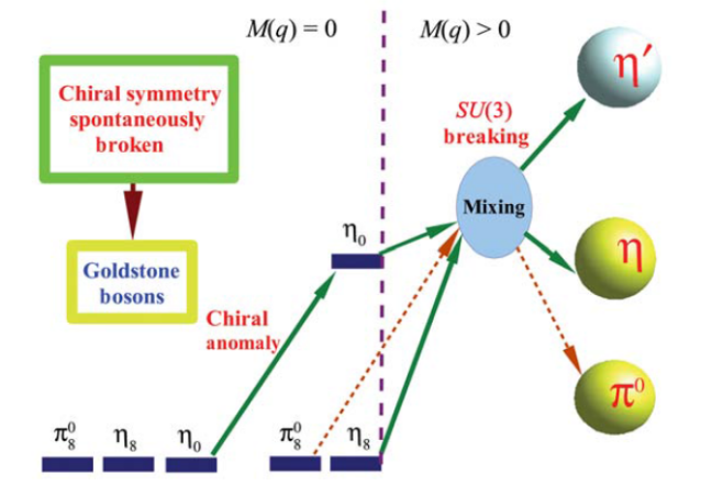 由于夸克凝聚,π、K和η等介子的质量与自发手征对称性破缺紧密相联。关于夸克凝聚,有一个Gell-Mann–Oakes–Renner (GMOR)关系,其中一个重要的参数-衰变常数(是表征手征对称性破缺的强度的一个物理量),可以通过π、K和η等介子的衰变来测量确定。另外,η′介子的质量来源还和轴反常有关。