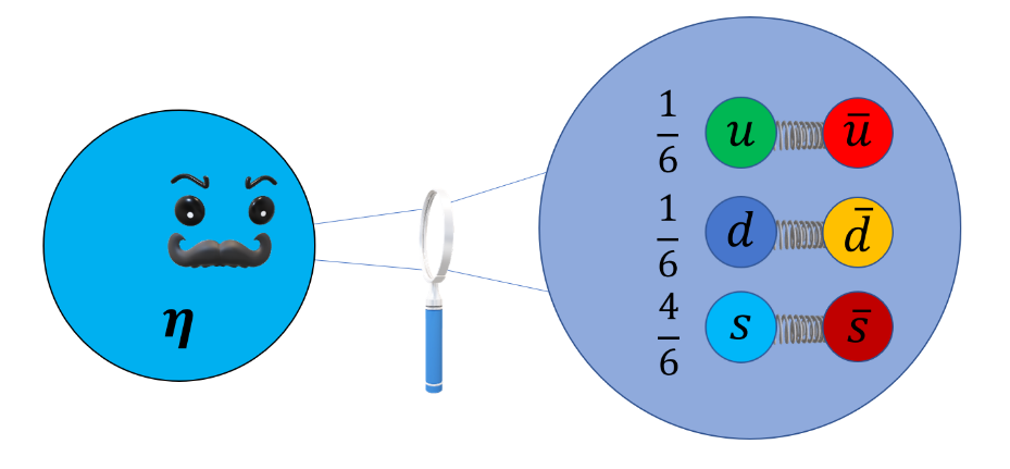 图4. η是一种特别类型的粒子,由正反上夸克对、正反下夸克对和奇异夸克对以1:1:4概率混合而成的介子,同时是一种戈德斯通玻色子。图|寇维