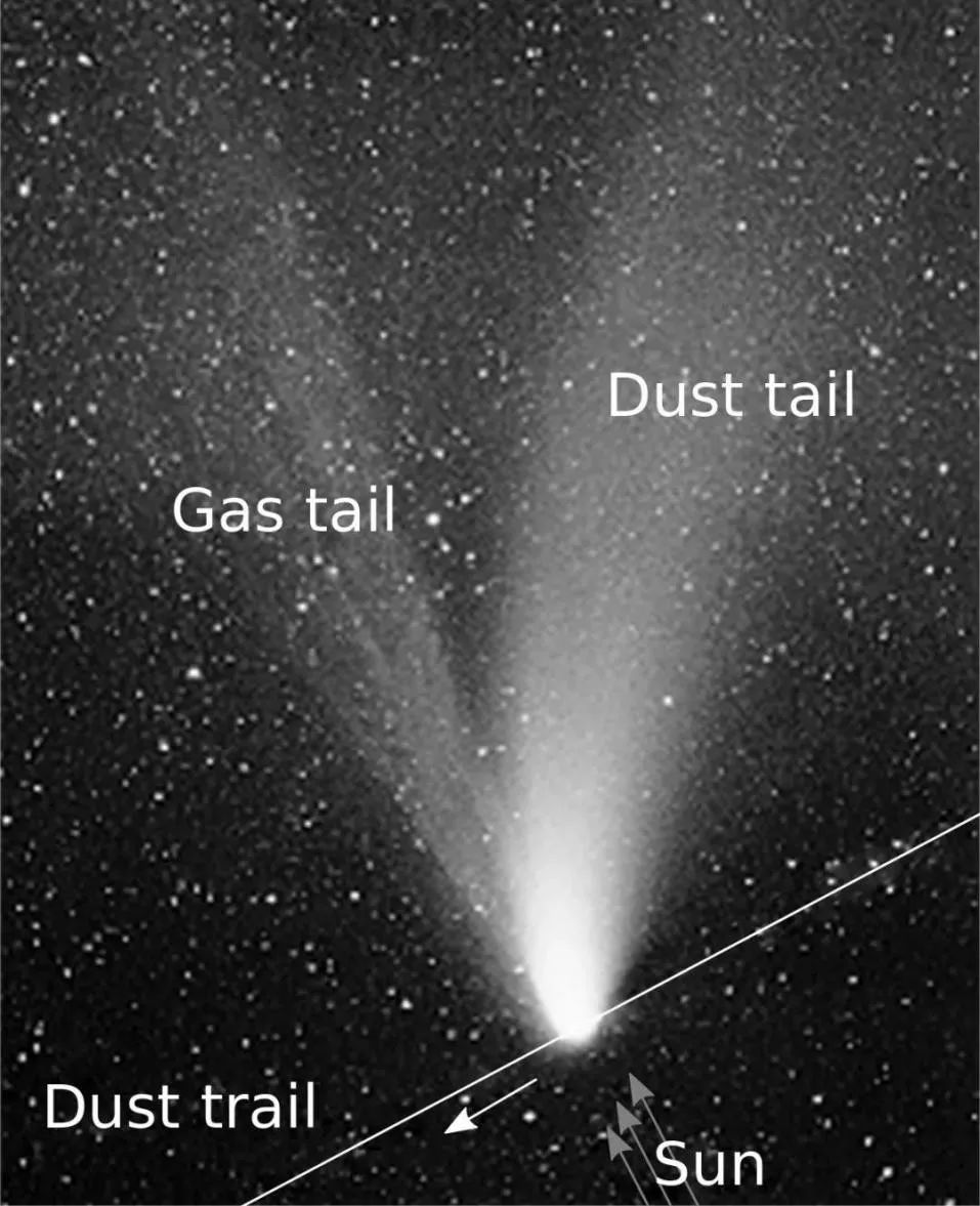 彗星的尾巴并不拖在飞行方向后方(沿着白色直线),而是朝向太阳反方向