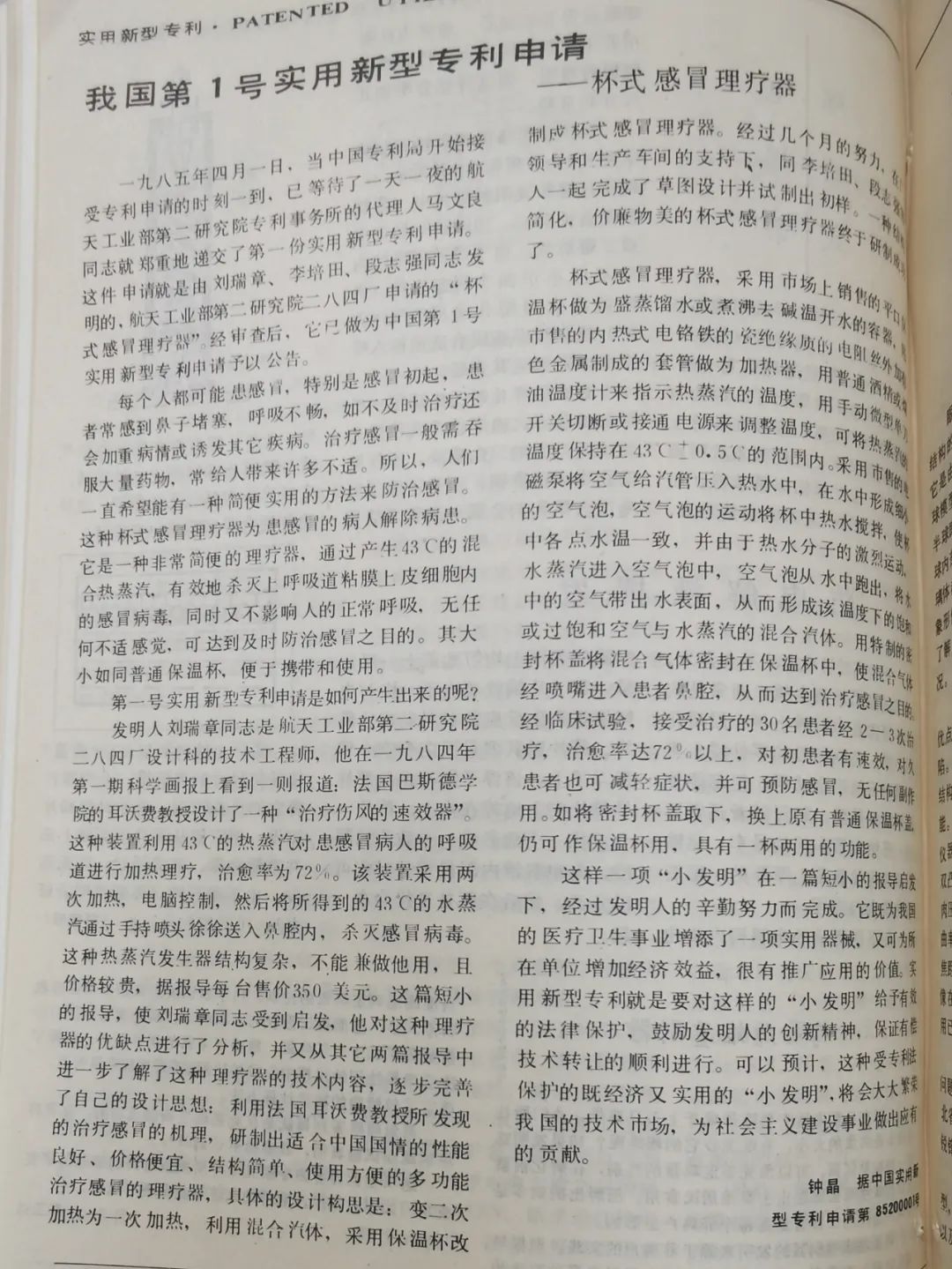 刘端章是航天工业部第二研究院284厂设计科的技术工程师,他在杂志上看到一则报道,上面介绍了一种治疗伤风的速效器,该装置可将43℃的水蒸汽徐徐送入鼻腔内,杀灭感冒病毒。
