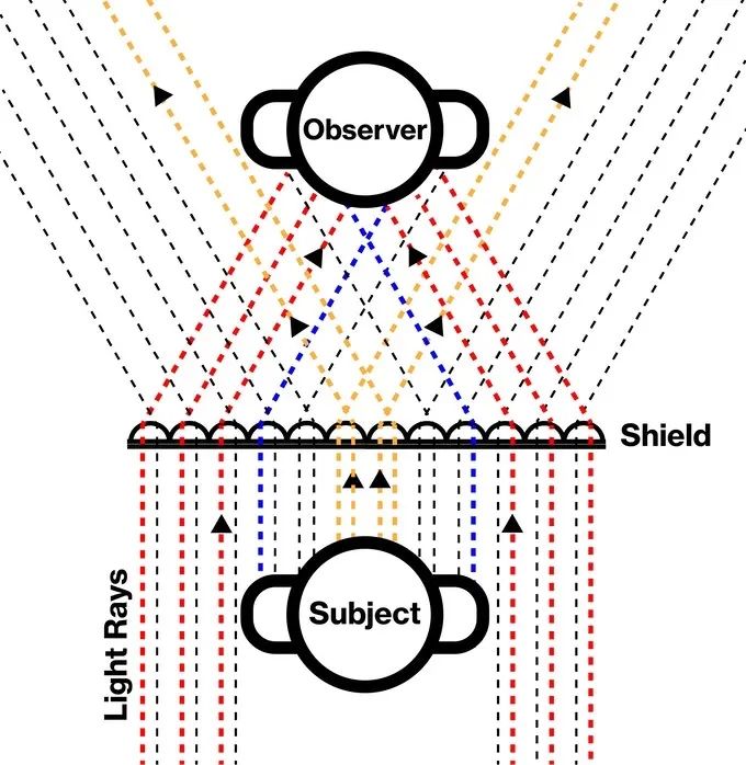 而在这面隐形盾牌上,工程师精准调整透镜的朝向,让大部分来自透镜后面的光被散射到观察者的两侧。这面隐形盾牌上的透镜是垂直排列的,这会让这面盾牌把更多其他方向的背景光线折射到观察者眼中。因为大范围的背景和被隐藏的主体相比往往更亮,占比更多,因此观察者往往只能看到被横向模糊的背景,而盾牌正后方被隐藏的物体则几乎消失不见。