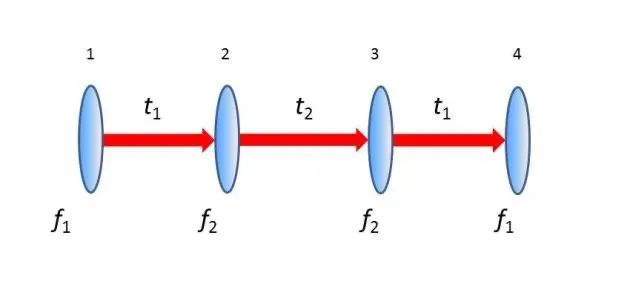 罗切斯特光学研究所还很慷慨的公布了这种光学系统制作教程。你只需要4个凸透镜,两个焦距为200毫米(f₁),两个透镜焦距为75毫米(f₂)。并且按照下图排列。其中t₁=f₁+f₂=275毫米,t₂=2f₂(f₁+f₂)/(f₁-f₂)。尽力把所有的透镜调整到一条直线上,就能在1号和2号透镜之间制造一片隐形区域。