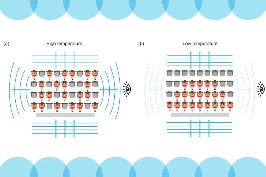 物质波与振动模式的关系可以比作观众与座位的关系。当费米子系统温度较高时(如左图),物质波会随机地以各种模式振动,其近邻的振动模式可能是空缺的;当系统温度非常低时(如右图),所有的物质波都会尽可能以能量最低的模式振动,其近邻振动模式大概率被占据了。(图片来源:MIT)