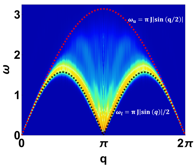 其中 J 为相互作用强度,系统满足 SU(2) 和平移对称性。通过贝特拟设,可得到其元激发为无能隙的双自旋子连续谱 [2]。图 1 展示了量子蒙特卡罗的模拟结果,分别有下界 ω1 = π · J |sin(q)| / 2 和上界 ωu = π · J |sin(q / 2)|。这里的双自旋子连续谱,来源于反铁磁基态中的一个自旋翻转,形成 |ΔM| = 1 的激发。由于一维系统不受链间相互作用的影响,|ΔM| = 1 的激发分裂成两个畴壁 (domain wall),即两个自旋子。每一个自旋子,携带自旋为 1 / 2,可在链上自由移动 [5]。