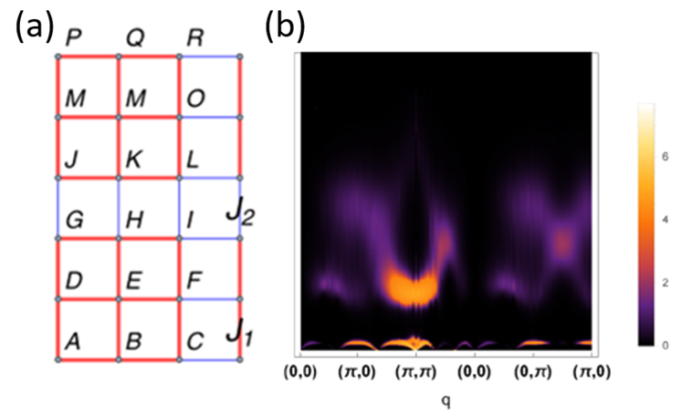 图 3. (a) 3 x 3 棋盘结构自旋模型的示意图,(b) g = J2 / J1 = 0.1 时的磁激发谱 [9]。