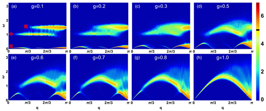 当 g = 0.2 时,如图 5(b) 所示,中、高能首先融合形成新的高能谱。此时,高能谱包含双重子、四重子和自旋子,犹如泾河一样浑浊,让人琢磨不透。随着 g 增大到 0.7 附近,如图 5(f) 所示,高、低能激发谱之间的能隙闭合,泾河的水流入渭河,高能部分的多种准粒子也开始分数化为自旋子。这种情况持续延续,直到 g = 1 时,如图 5(h) 所示,系统演变为均匀的海森堡自旋链。此时,所有的高能准粒子都分数化为自旋子,两河之水最终都融为一体、不再有泾渭之分。