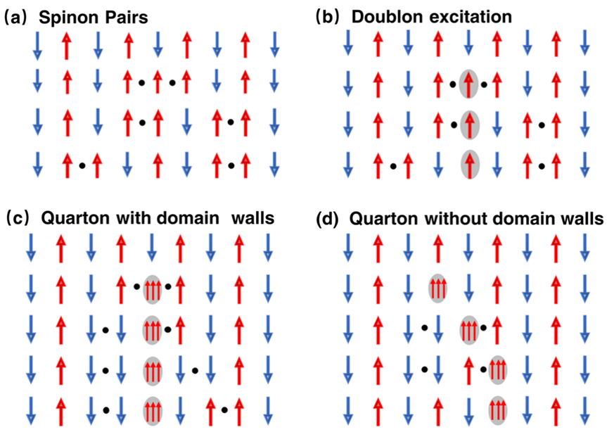 所谓自旋子,携带自旋 1/2,是翻转一个自旋形成的。它们通常成对出现,在一维自旋链上自由移动。双重子和四重子的示意图中,箭头代表三聚体的有效自旋。有效自旋的翻转,意味着三聚体内能级的跃迁。如图 7(b) 所示,中间蓝色的有效自旋向上翻转,代表被激发的三聚体由基态跃迁到第一激发态,产生 |ΔM| = 1 的激发。被翻转的有效自旋与周围的有效自旋形成两个畴壁,即两个自旋子。