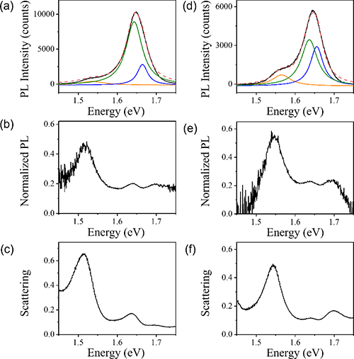 图2. 银纳米线-单层WSe₂耦合体系的荧光谱(a, d),归一化的荧光谱(b, e)及对应的散射谱(c, f)。