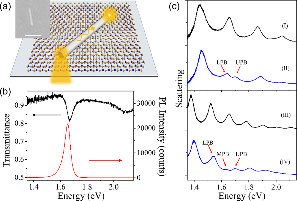 图1.(a)银纳米线-单层WSe₂耦合体系的示意图和光学显微镜图像。(b)玻璃基底上单层WSe₂的透射谱和荧光谱。(c)玻璃基底上(I,III)和单层WSe₂上(II,IV)的银纳米线的散射谱。