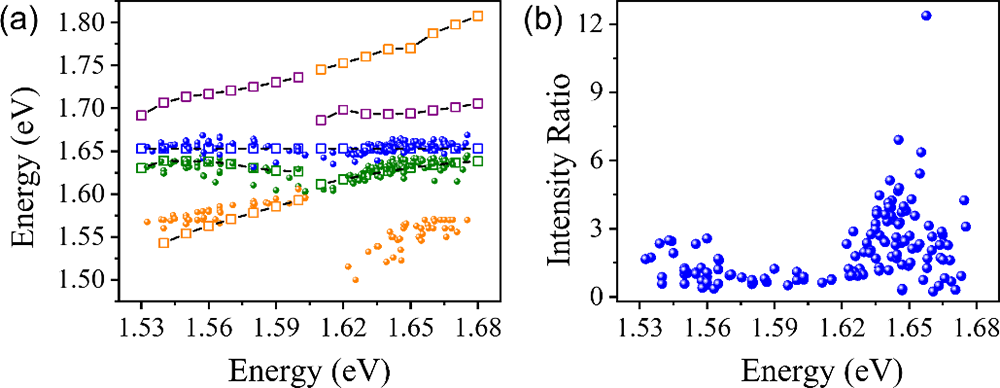 图3.(a)实验荧光谱(实心点)及计算荧光谱(空心点)拟合峰的能量随低能量等离激元模式的能量₁的变化关系。(b)实验荧光谱中低能量极化激元峰与激子峰的强度比值随₁的变化关系。