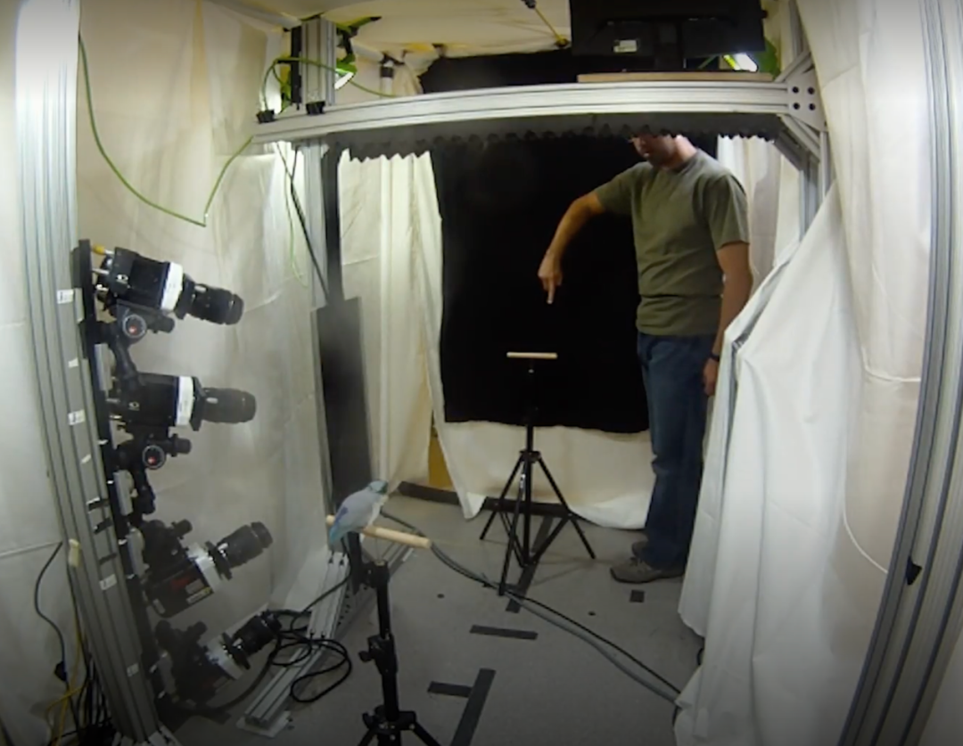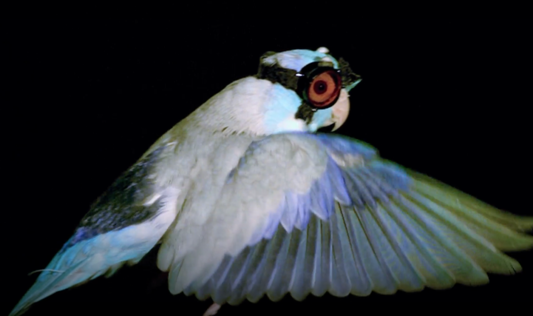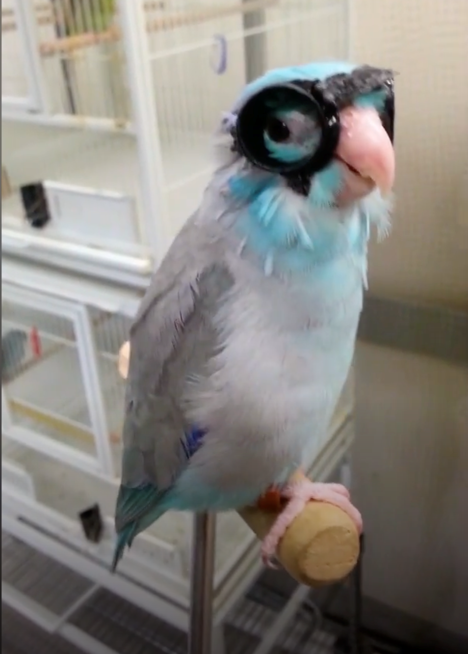 这只被科学家戴上护目镜的鸟名叫欧比,一只来自斯坦福大学的太平洋鹦哥(Forpus coelestis)