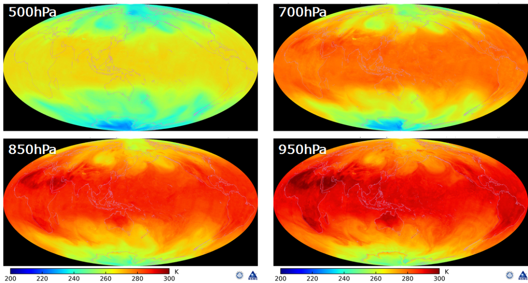 风云三号E星全球大气温度场垂直层分布(2021年9月27日黎明时刻)。该图展示了2021年9月27日黎明时刻950百帕、850百帕、700百帕和500百帕四个高度全球的温度分布情况