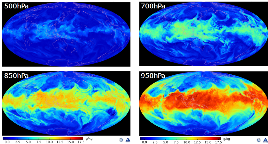风云三号E星全球大气湿度场垂直层分布(2021年9月27日黎明时刻)。图中四个小图分别为950百帕、850百帕、700百帕和500百帕的水汽分布图。可以看出,越在低层,水汽含量越充沛。我们还可以看到受到印度季风和东亚季风的影响,为我国源源不断地带来了印度洋和西太平洋大量的水汽