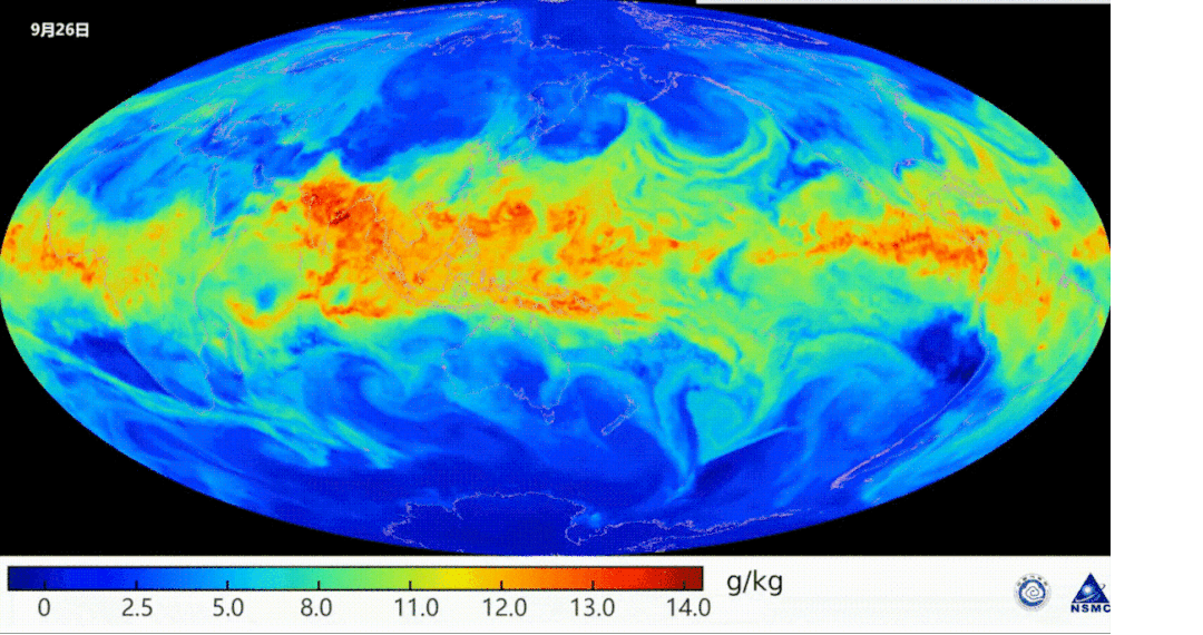 风云三号E星全球大气湿度场时间演变(2021年9月11日-26日,黎明时刻,850百帕)。图中可见,我国东部和南部洋面上有两个高湿度区,分别对应2021年第13、14号台风“康森”和“灿都”。