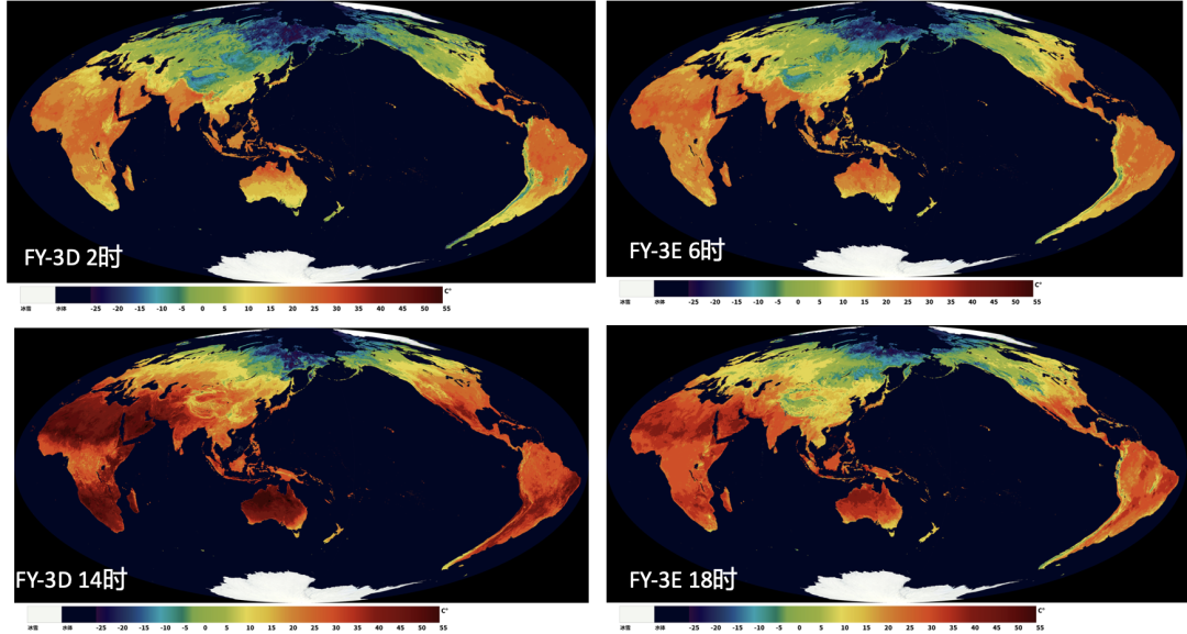 2021年10月全球地表温度产品。风云三号D、E两颗卫星获得的全球昼夜与晨昏四个时刻的地表温度,可以形成观测时间链。图中暖色表示温度高、冷色表示温度低