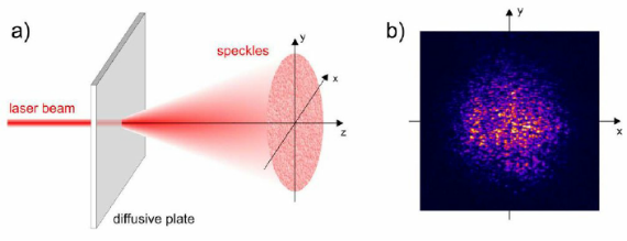 其实,我们更应该来分析一下这里的散斑是什么。Speckle这个词最早是指被激光照明的物体,其表面呈现颗粒状结构。一开始,散射成像采用的是赝热光源——激光经过旋转毛玻璃,属于非相干光,成像探测器上得到的与上面说的Speckle看起来很像,也被称为散斑。
